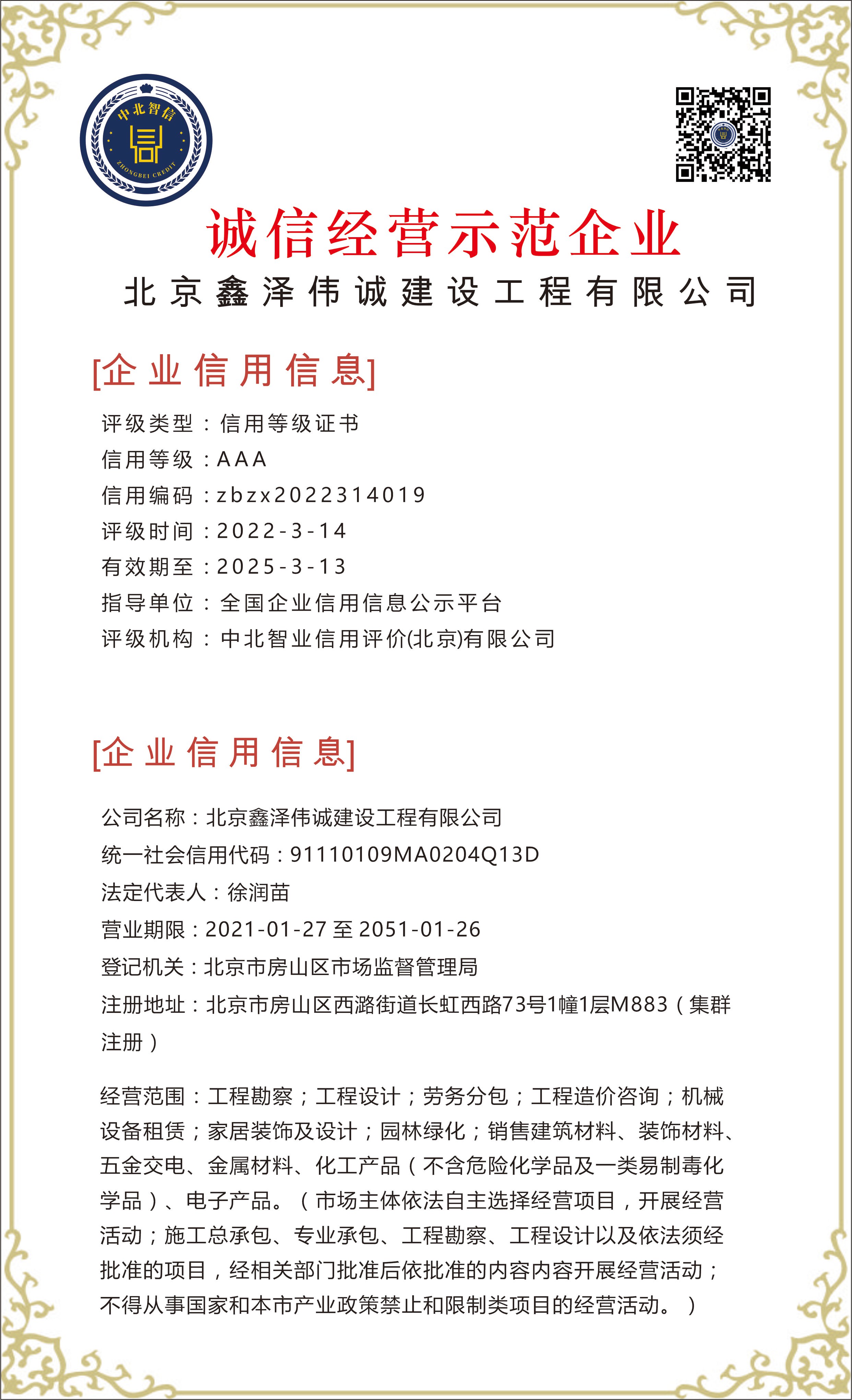 北京鑫泽伟诚建设工程有限公司——【诚信经营示范企业】