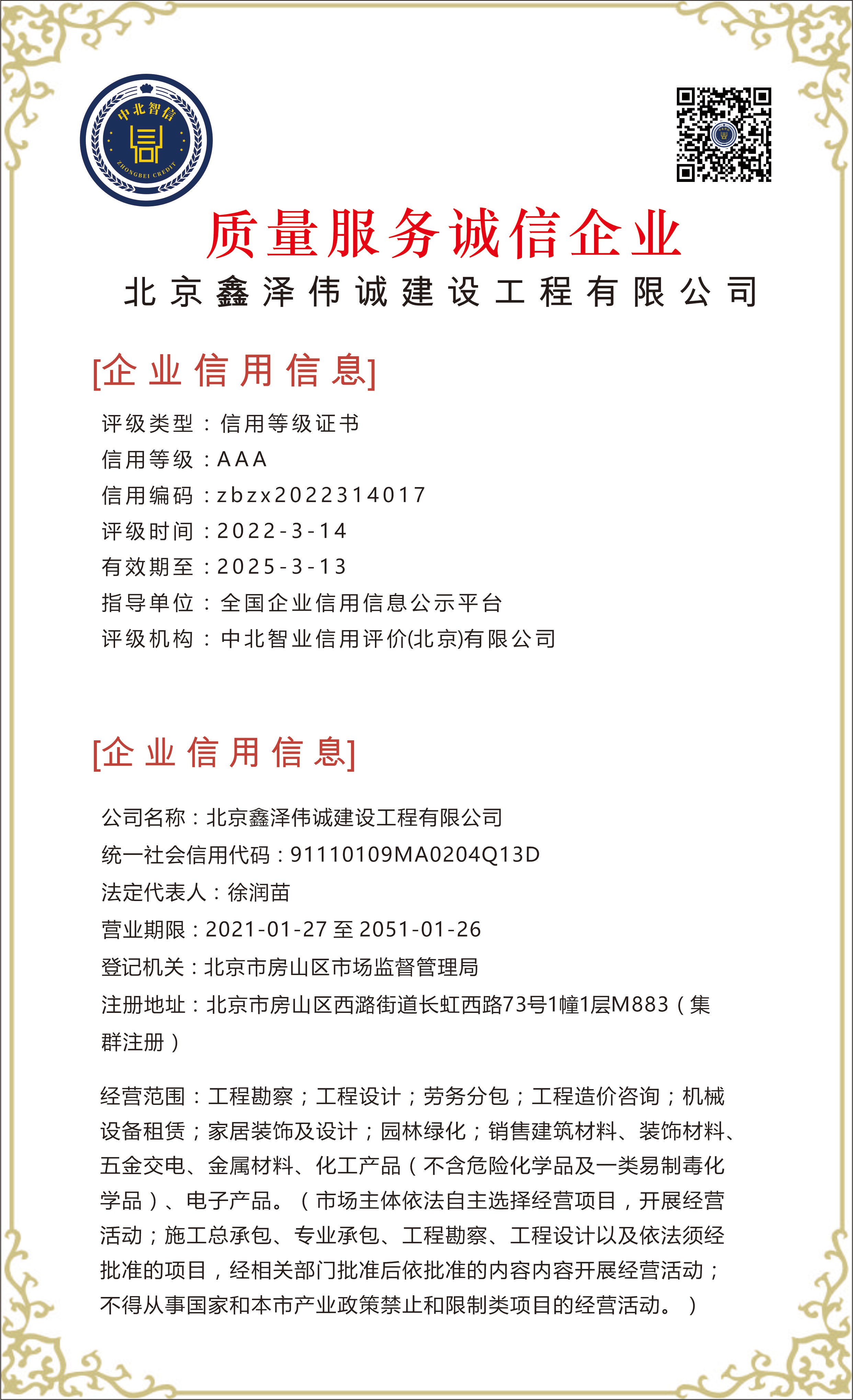 北京鑫泽伟诚建设工程有限公司——【质量服务诚信企业】