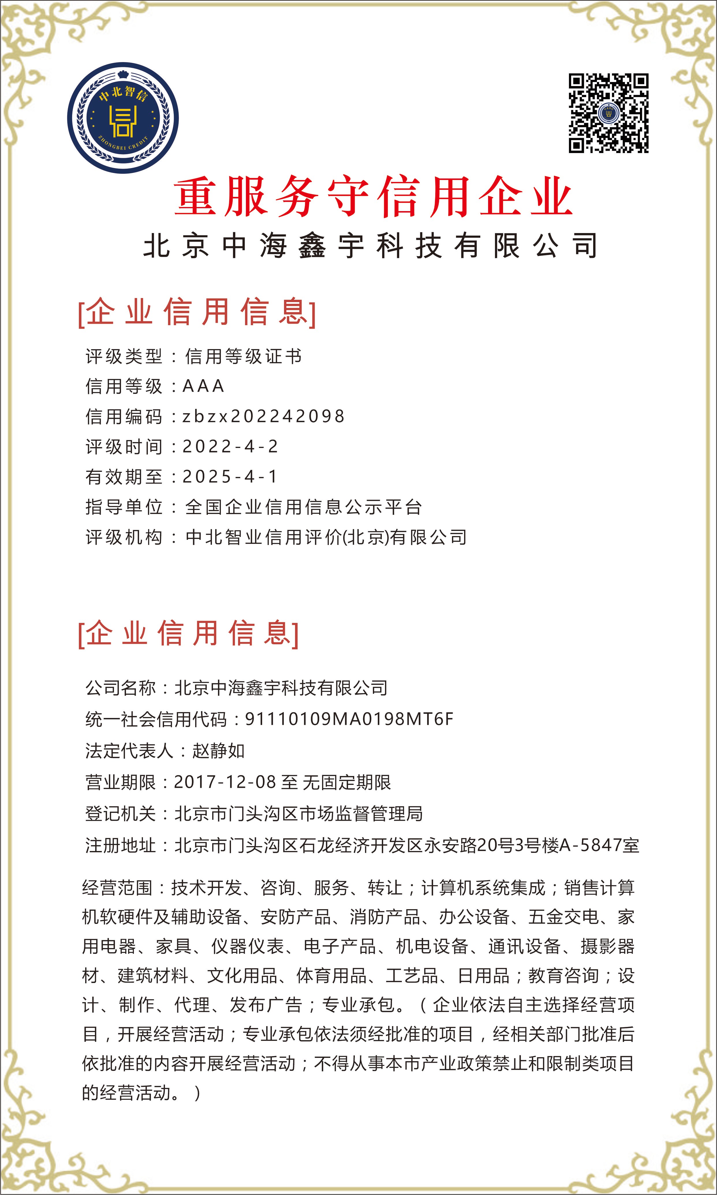 北京中海鑫宇科技有限公司——【重服务守信用企业】