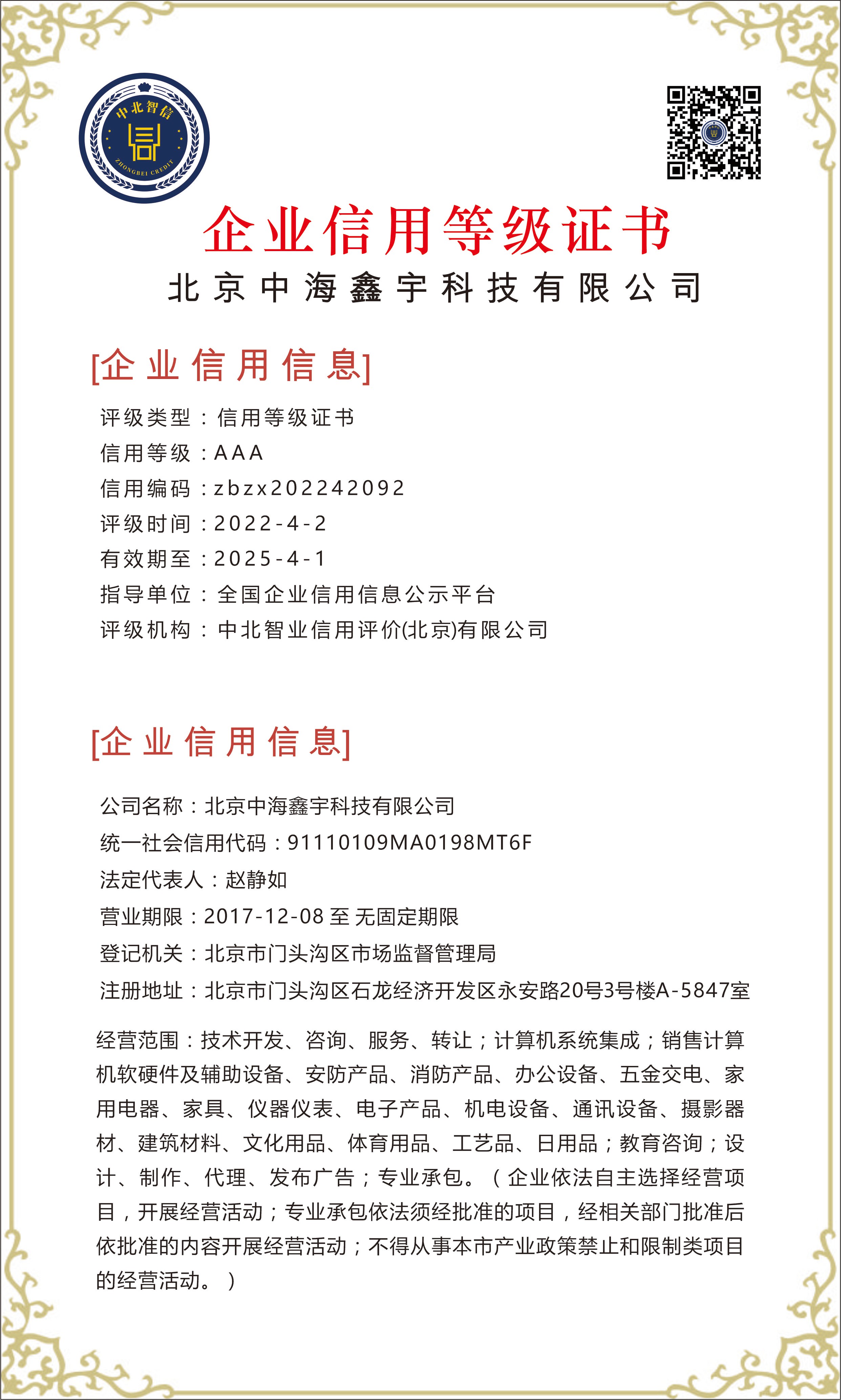 北京中海鑫宇科技有限公司——【企业信用等级证书】