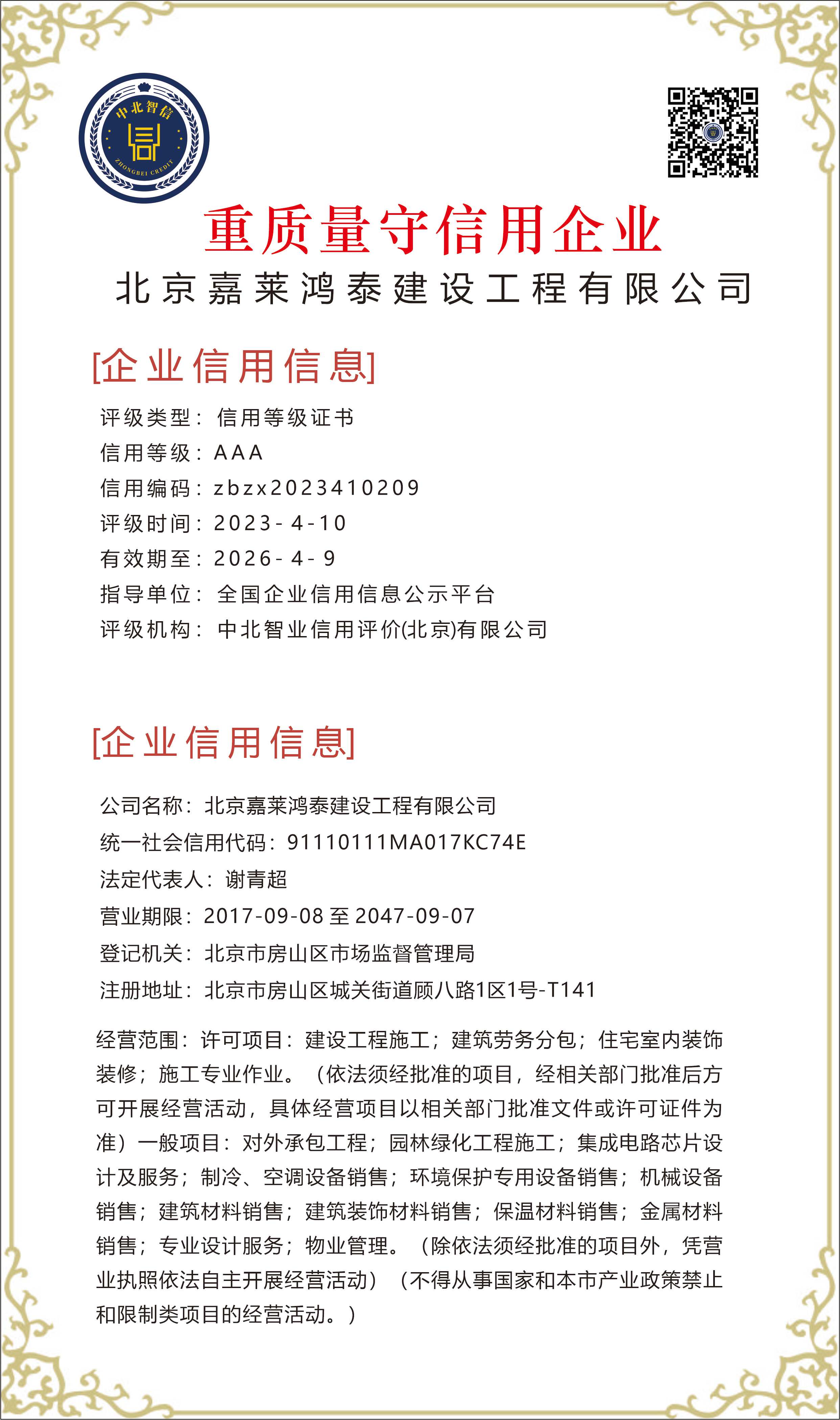 北京嘉莱鸿泰建设工程有限公司——【重质量守信用企业】