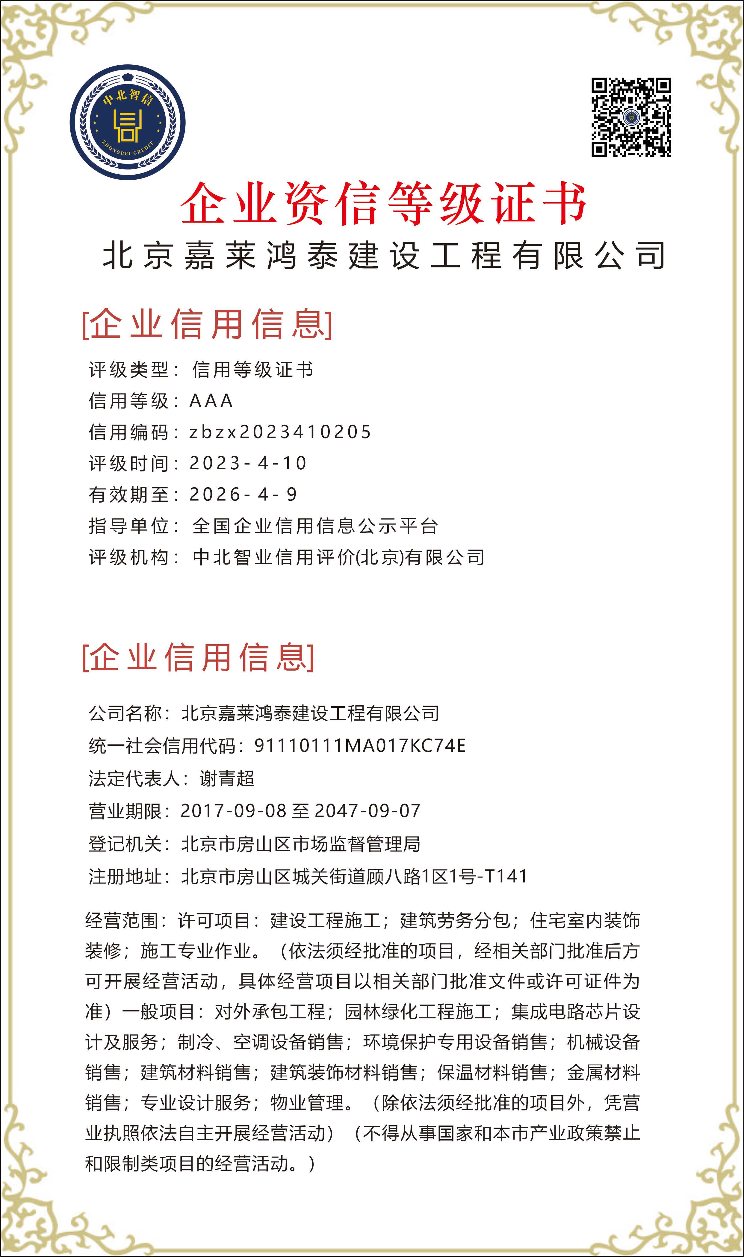 北京嘉莱鸿泰建设工程有限公司——【企业资信等级证书】