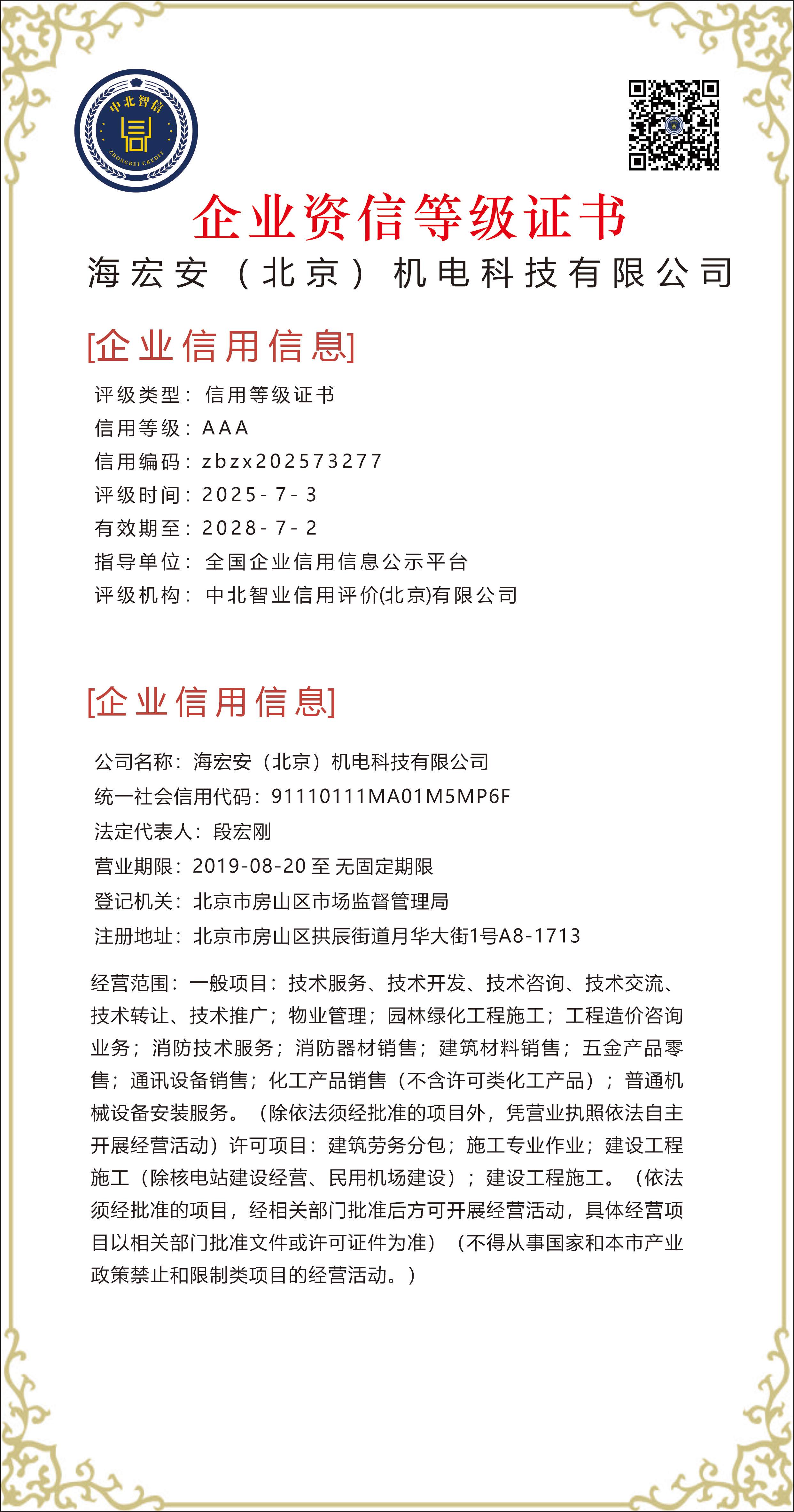 海宏安(北京)机电科技有限公司——【企业资信等级证书】