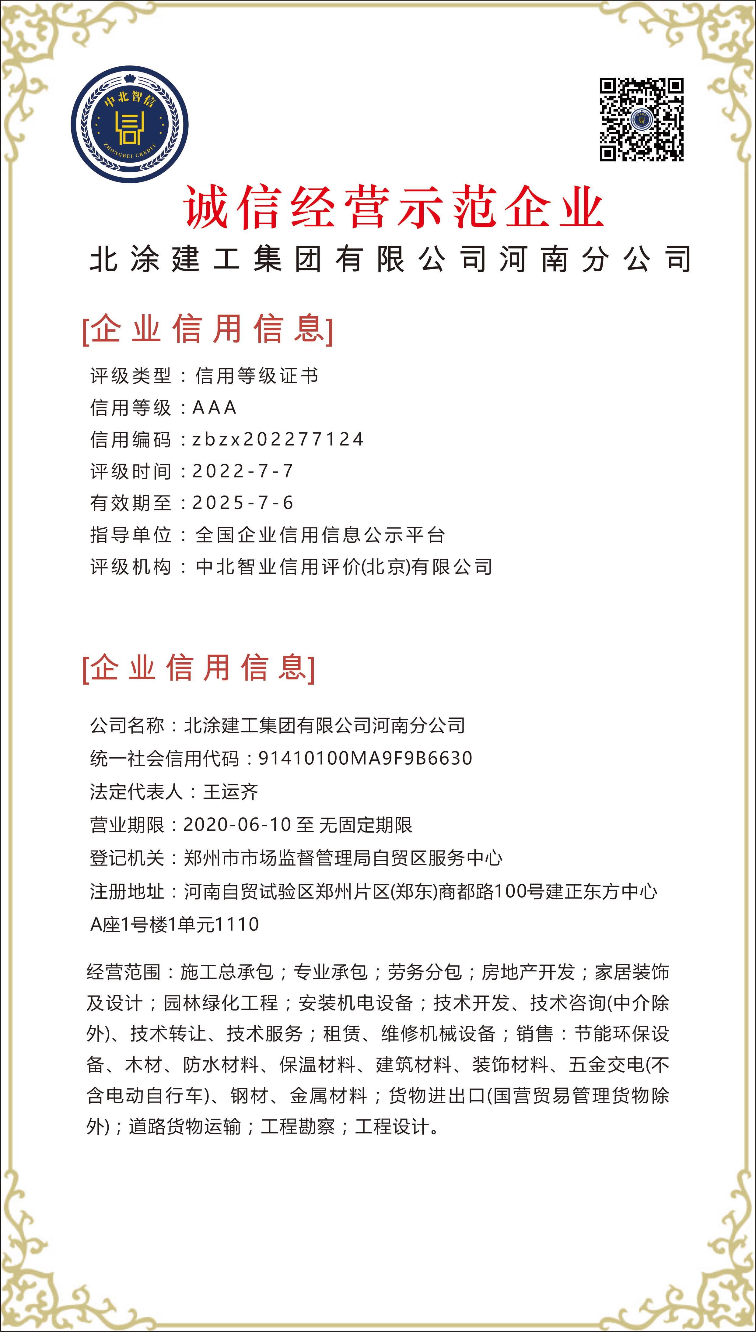 北涂建工集团有限公司河南分公司——【诚信经营示范企业】