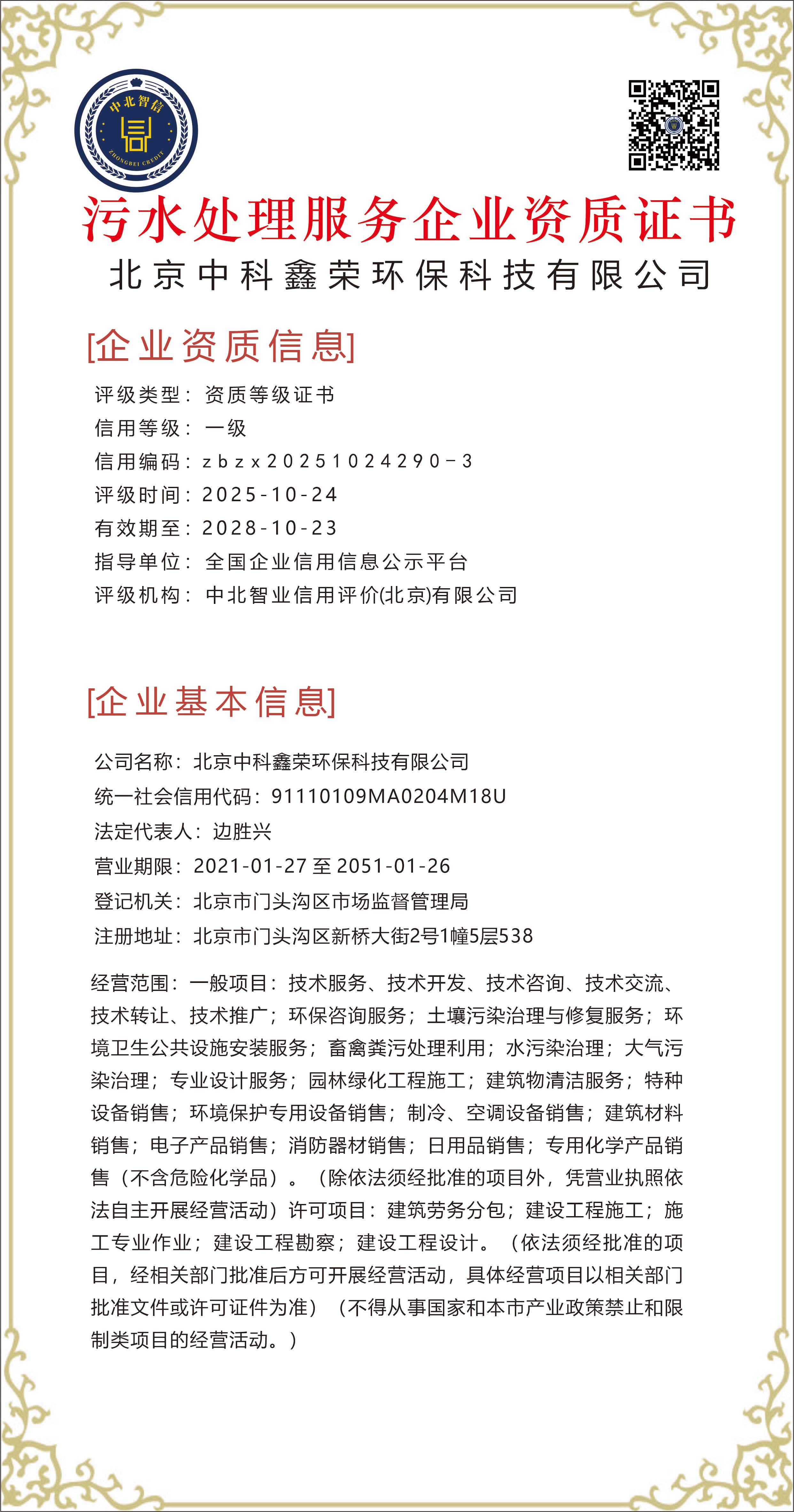 北京中科鑫荣环保科技有限公司——【污水处理企业资质证书】