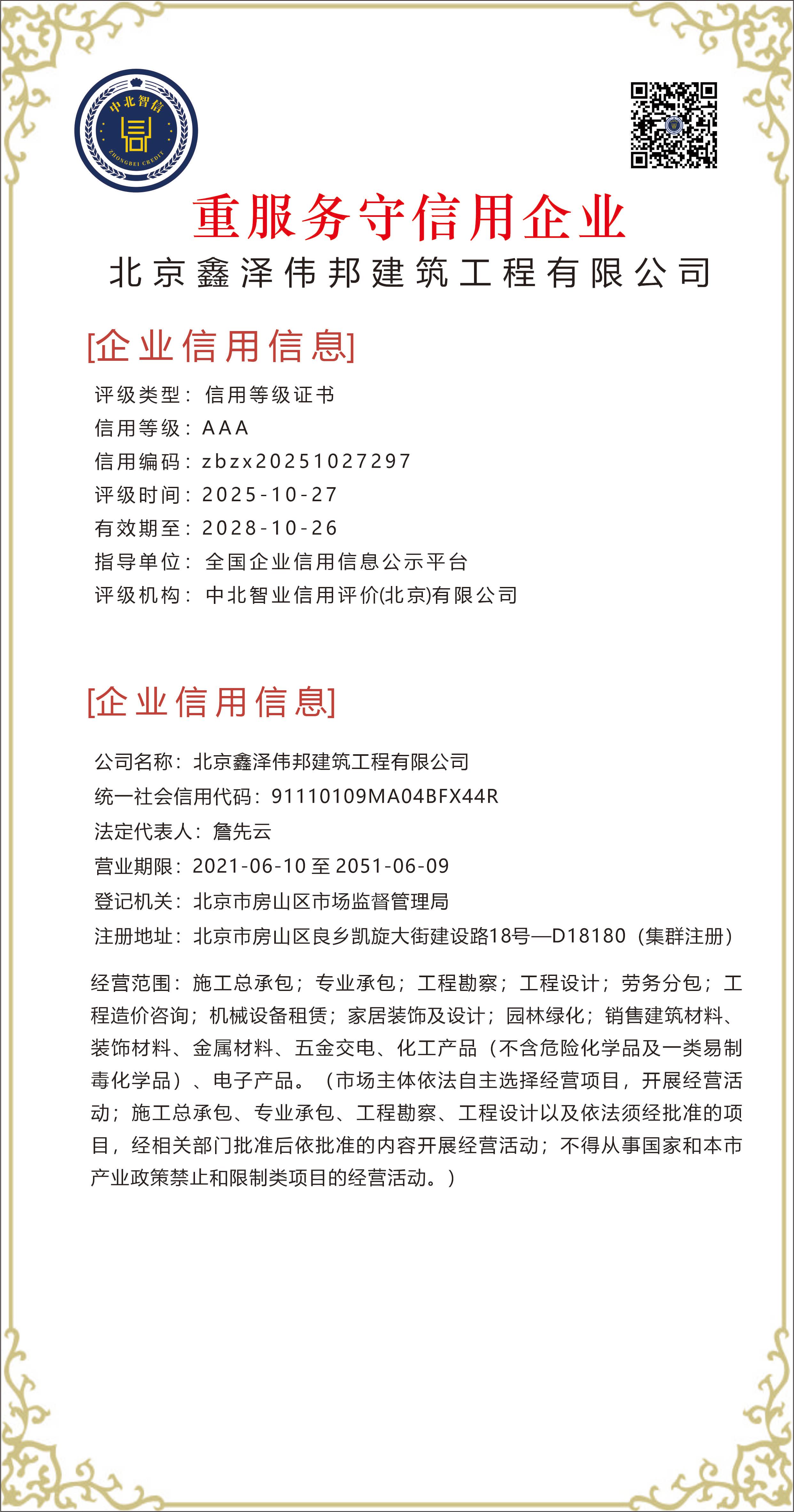 北京鑫泽伟邦建筑工程有限公司——【重服务守信用企业】
