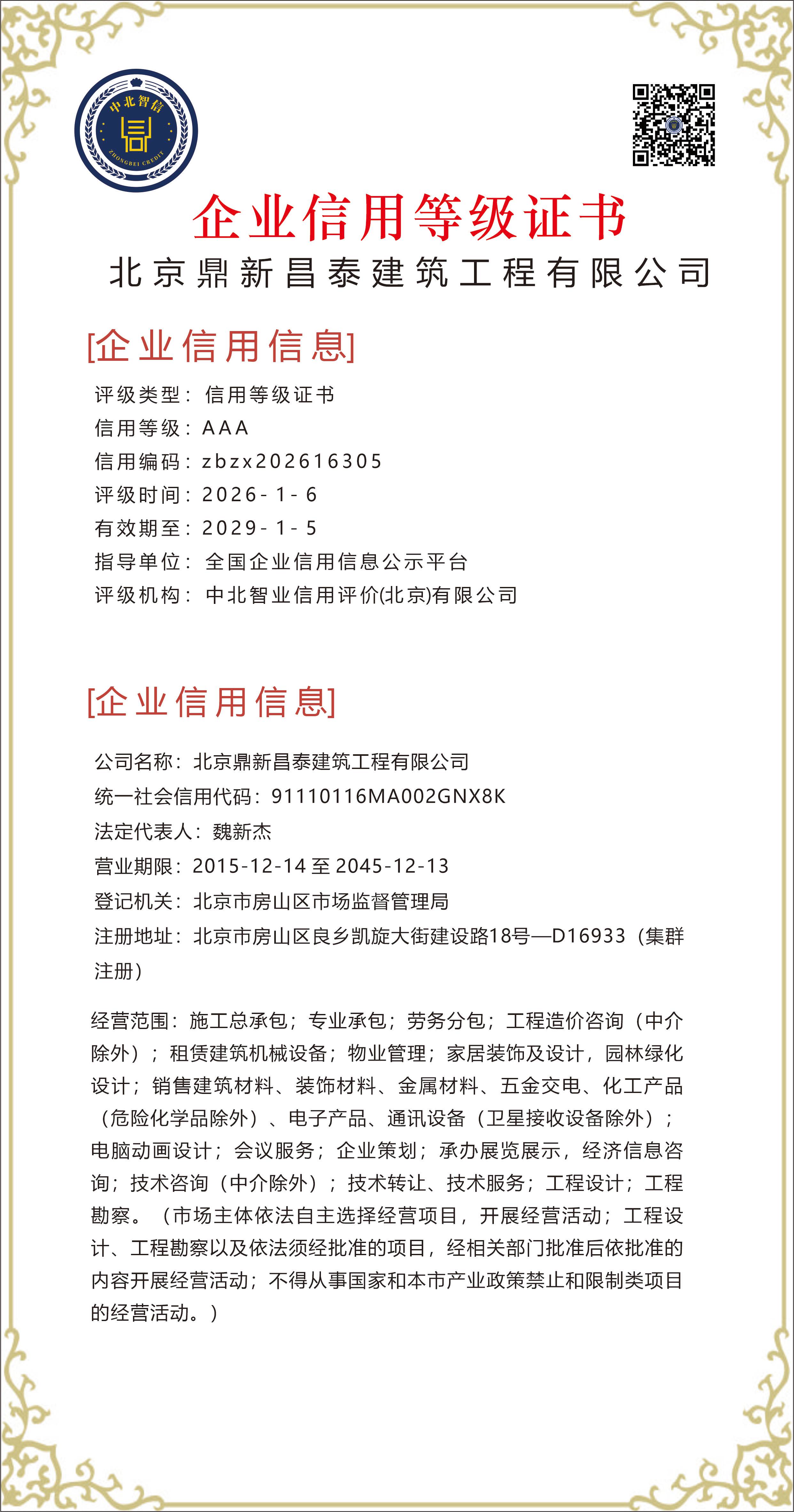 北京鼎新昌泰建筑工程有限公司——【企业信用等级证书】