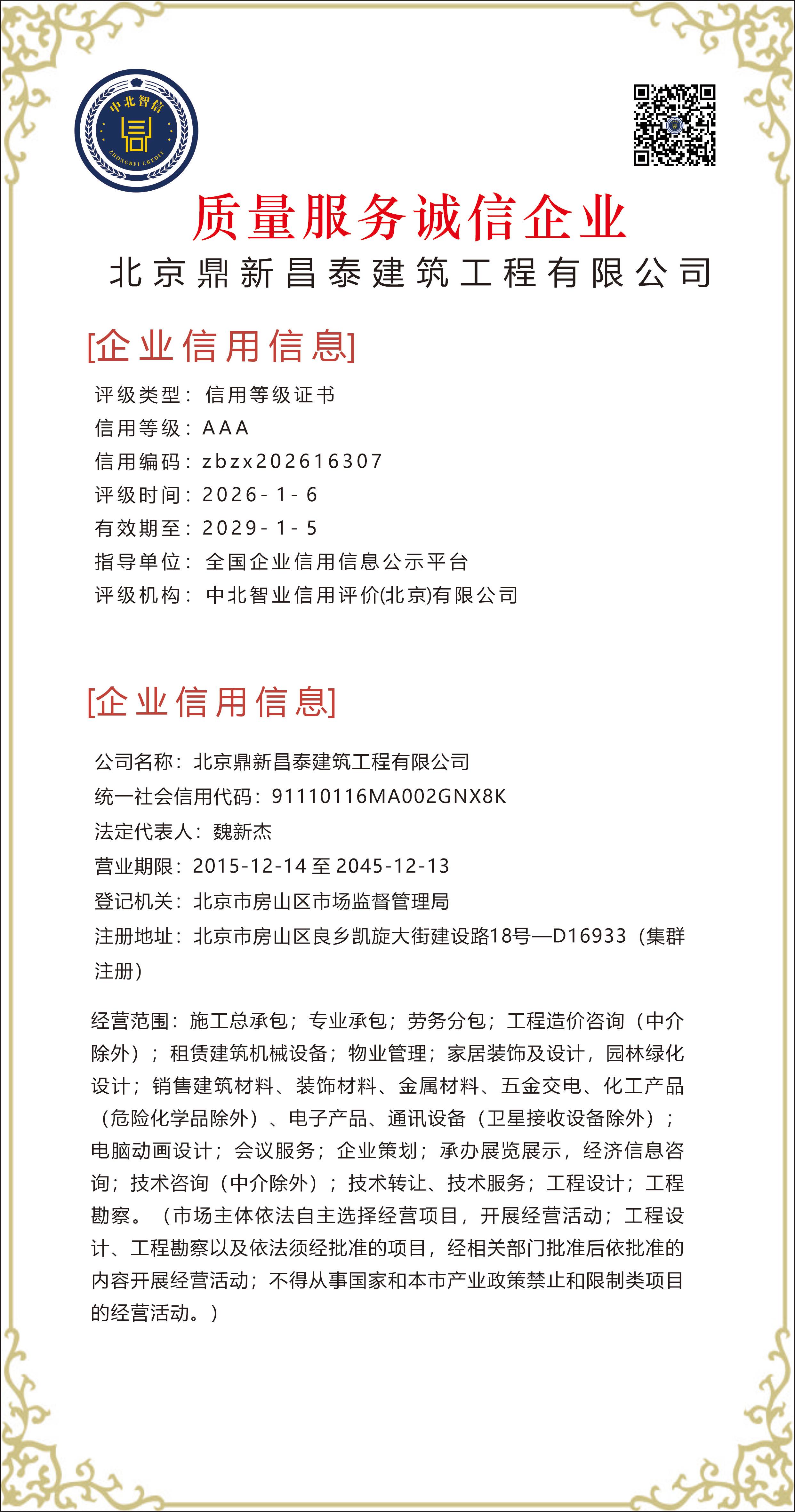 北京鼎新昌泰建筑工程有限公司——【质量服务诚信企业】